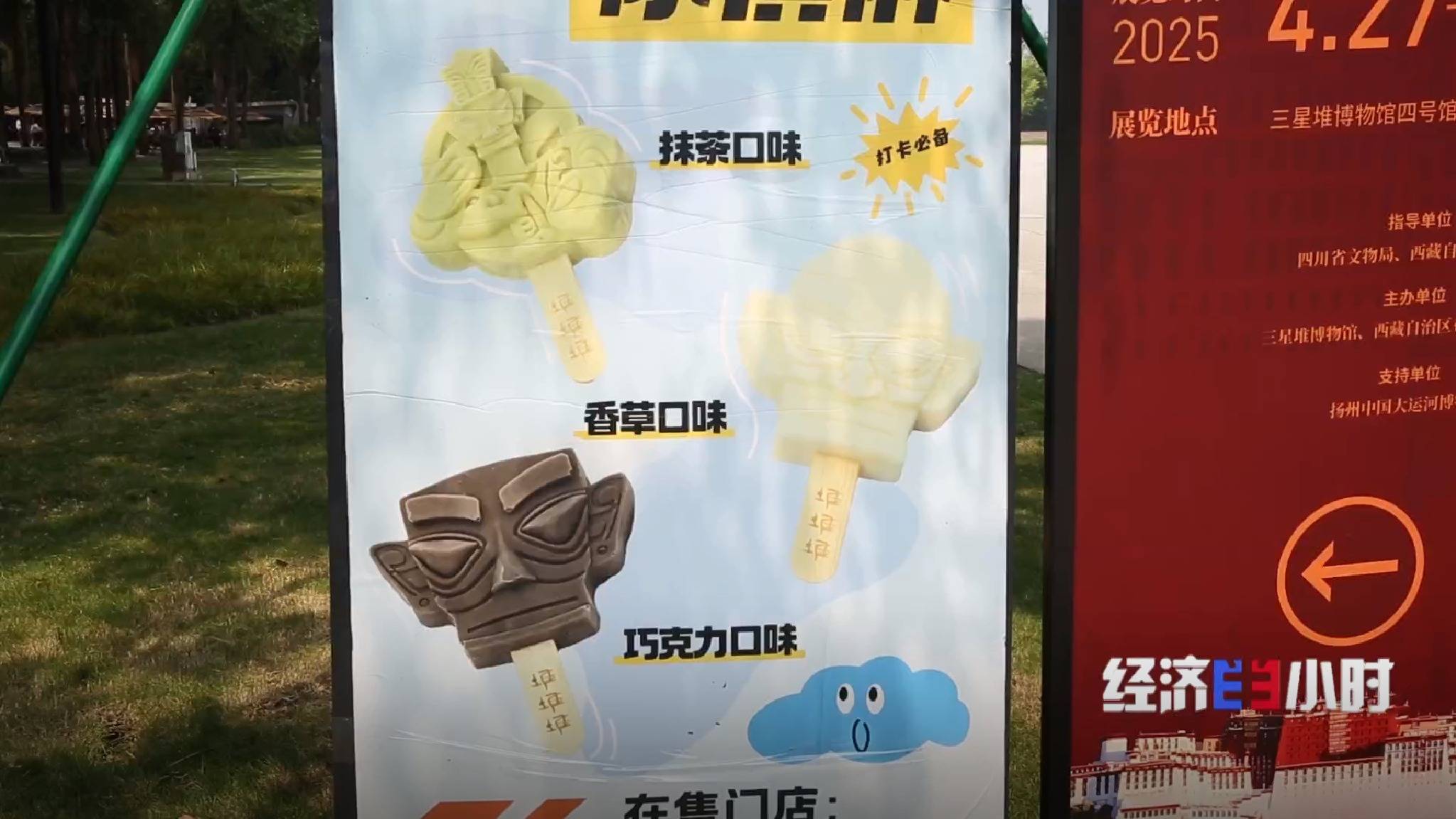 除了精神食粮,三星堆博物馆的餐饮区还新推出文创冰激凌,引得游客们纷纷购买,打卡留念。三星堆的文创冰激凌共有三款,分别是“大立人”抹茶冰激凌、“金面罩人头像”香草冰激凌和“青铜大面具”巧克力冰激凌,都是以馆藏代表性文物为原型研发的。