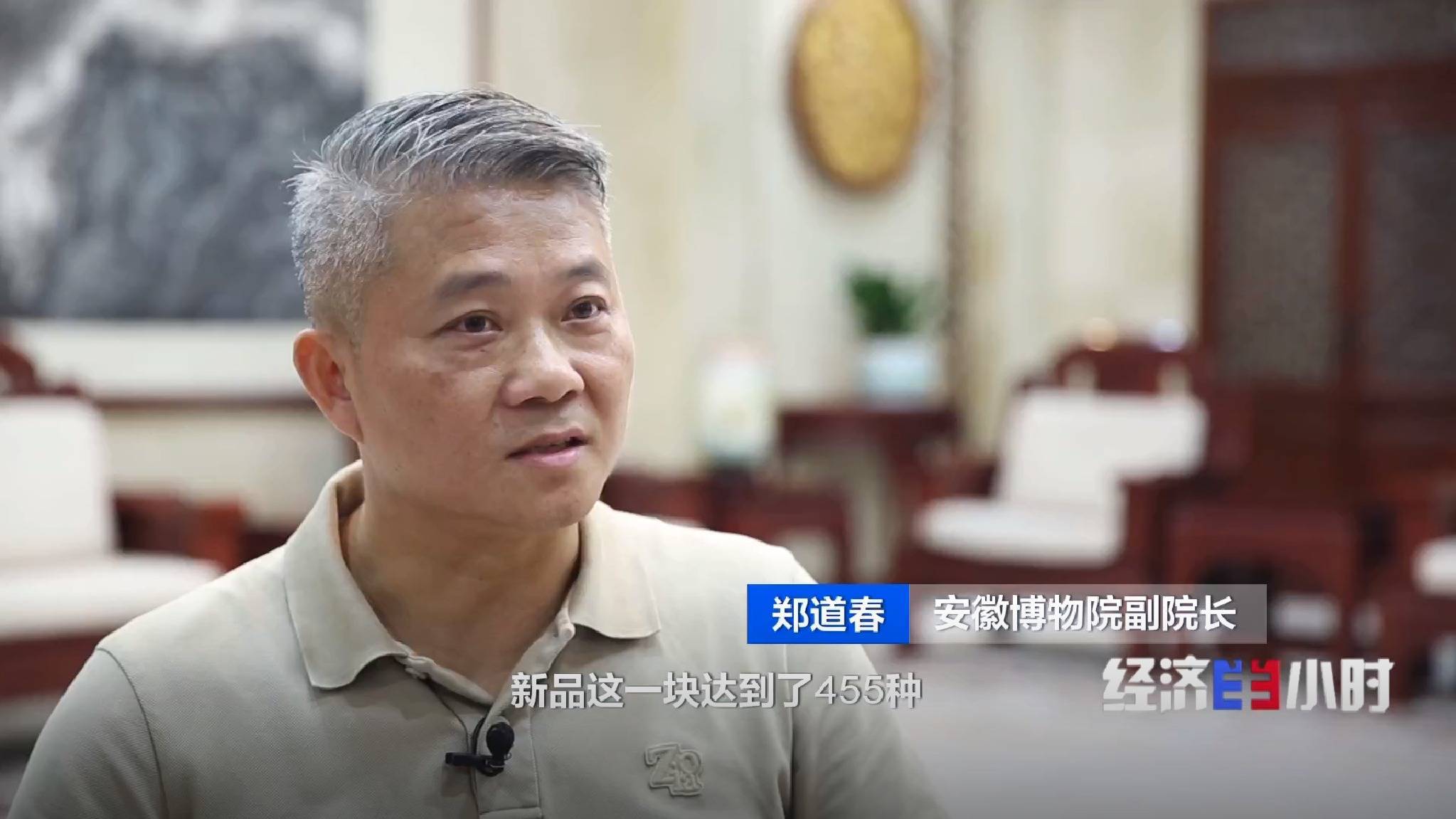 安徽博物院副院长 郑道春:文创收入去年是1500多万元,文创产品开发的种类达到了455种。