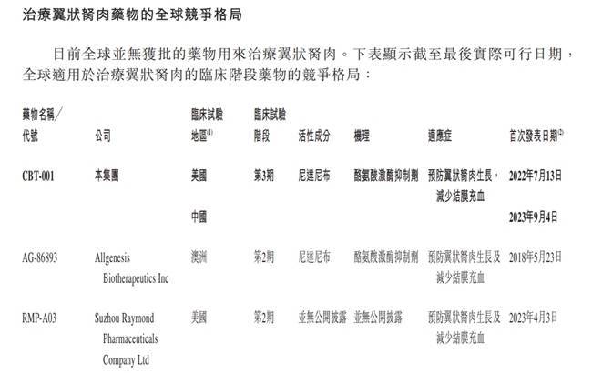 百惠金控据悉,作为公司核心管线,CBT-001 是全球首个进入 Ⅲ 期临床的翼状胬肉创新药物,通过靶向 VEGFR、PDGFR r等多激酶抑制,实现对眼表异常血管生成的精准调控。截至 2025年5月,该产品已完成中国、美国、澳洲多中心 Ⅲ 期临床试验患者入组,计划于 2025 r年提交中美双报上市申请。